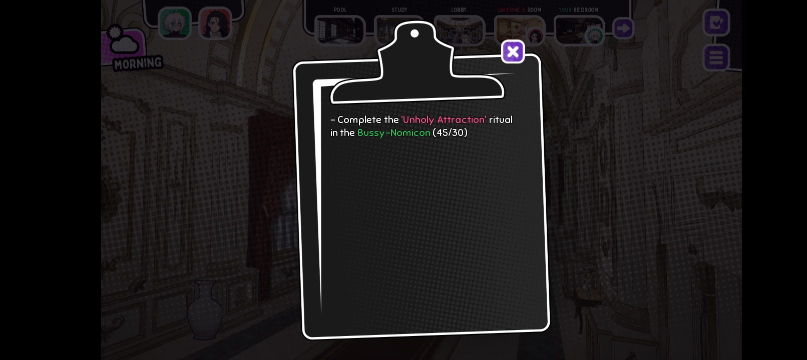 Thanks. I was able to finish the demo now. My first thought was to go to the study an click on the floating book. It seemed the most logical next step as all previous interactions with the Bussy-Nomicon was in the study up untill now.